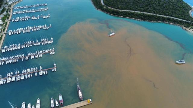 Antalya'nın Kaş ilçesinde etkili olan yağışın ardından deniz suyunun bir kısmı kahverengiye döndü.
